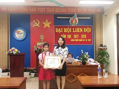 Cô Vương Thị Quyên - Tổng phụ trách Đội trao Giấy khen của Hội đồng đội Thị xã Đông Triều cho cá nhân đạt thành tích Xuất sắc trong năm học 2016 - 2017