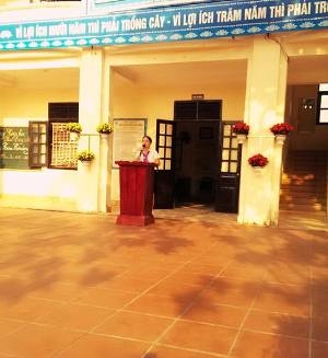 Cô Vũ Thị Hồng - Hiệu trưởng nhà trường phát biểu trong lễ chào cờ